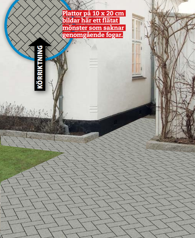 Betongplattor på 10 x 20 cm bildar här en mer levande yta än om de hade lagts med förskjuta förband. Eftersom fogarna är genomgående ska mönstret läggas diagonalt.