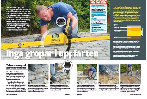 Innan stenarna avlägsnas kan du med fördel mäta gropens djup. På så sätt kan du lista ut om det är bärlagret som har satt sig. Om så är fallet måste det rätas upp. Annars kommer problemet bara att dyka upp igen. Märk till sist upp gropens omkrets med krita.