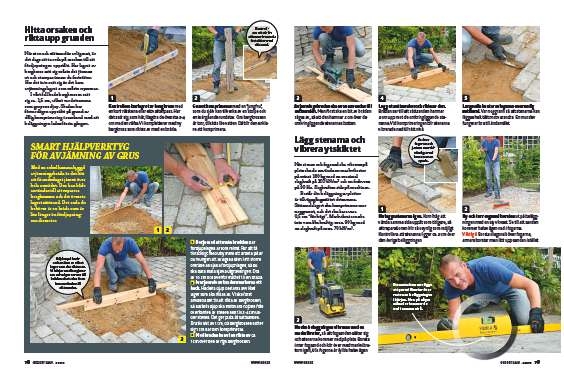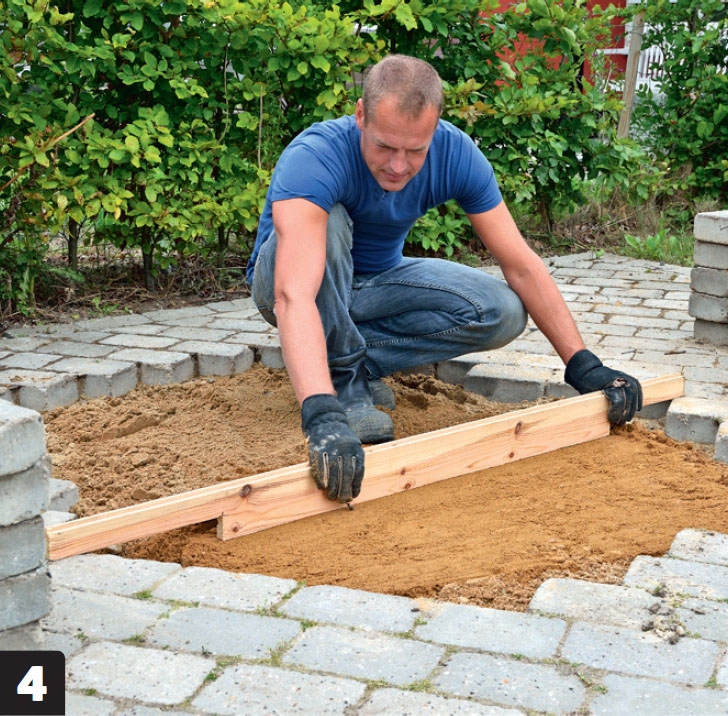 Med en enkel hemmabyggd avjämningsbräda är det lätt att få underlaget jämnt över hela området. Den kan både användas till att reparera bergkrossen och det översta lagret sättsand. Det enda du behöver är en bräda som är lite längre än fördjupningens diameter.