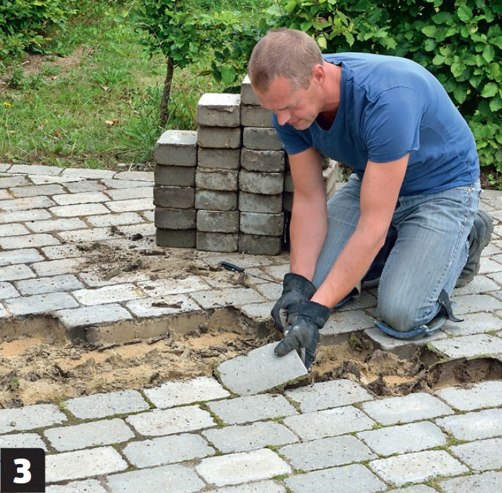 Stenarna kan nu tas bort en efter en. Marksten blir lätt kantstött, så det lönar sig att stapla dem så att de ligger säkert. Ta bort så många stenar att du får plats att gräva och rikta av senare.