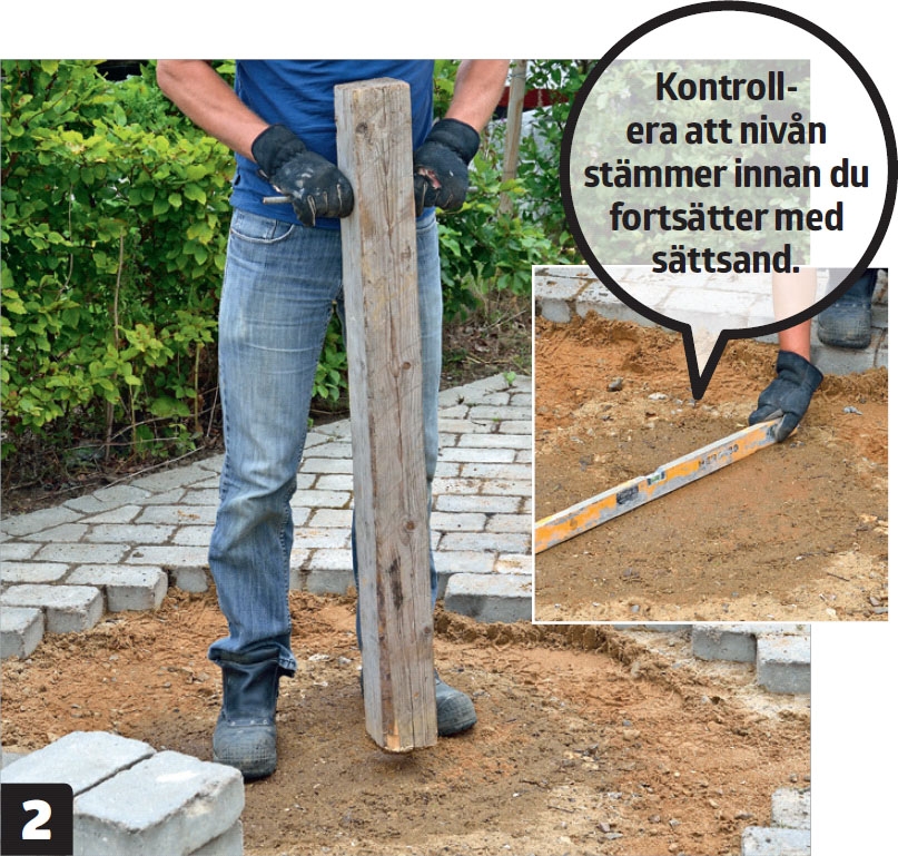 Lägg ut sättsanden och rikta av den. Brädan ser till att sättsanden hamnar 2 cm upp mot de omkringliggande stenarna. Vid komprimeringen blir stenarna vibrerade ned till rätt nivå.