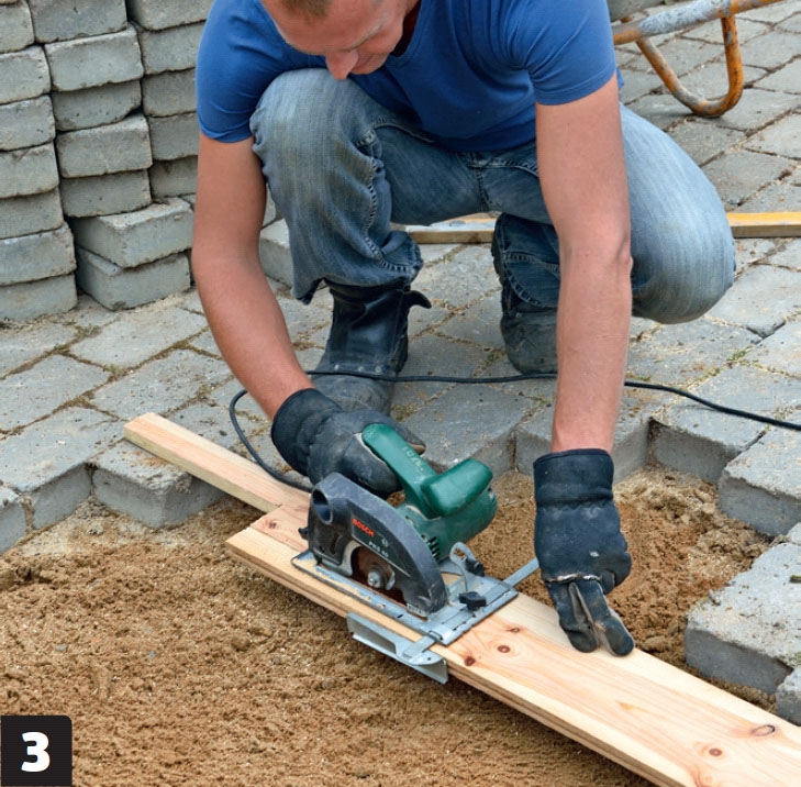 Avjämningsbrädan ska även användas till sättsanden. Men först ska en bit av brädan sågas av, så att den hamnar 2 cm över de omkringliggande stenarnas botten.