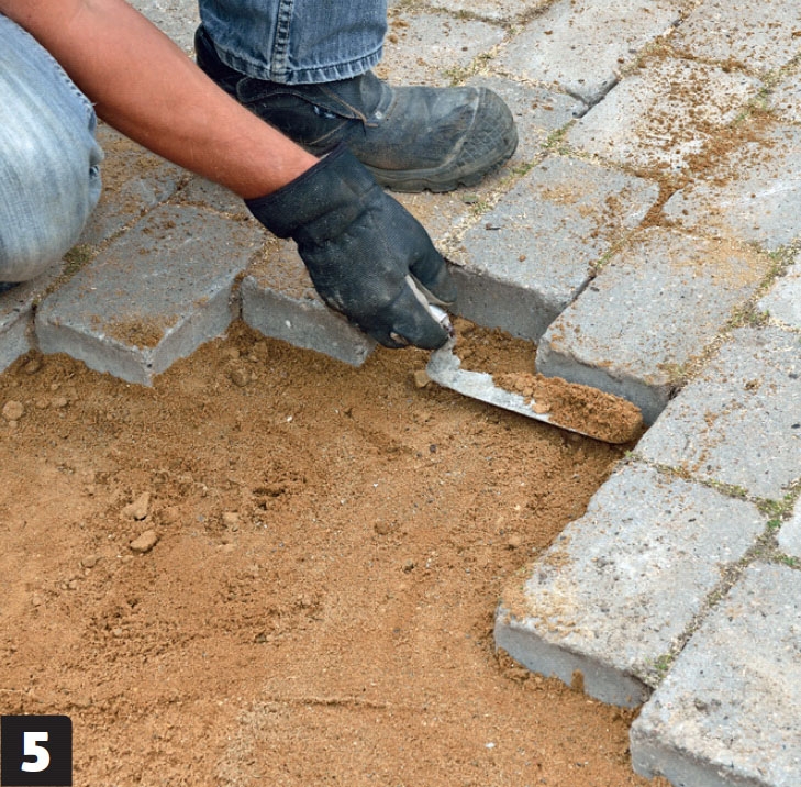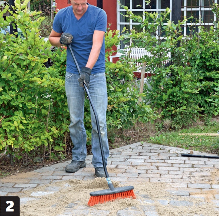 Ny och torr fogsand borstas ut på beläggningen med en styv kvast. Se till att sanden kommer hela vägen ned i fogarna.