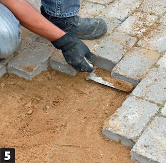 Rensa hela vägen runt längs kanten av de stenar som är kvar. Sedan avlägsnas allt fogmaterial, mossa och annat skräp från området, så att det bara är ren sand kvar.