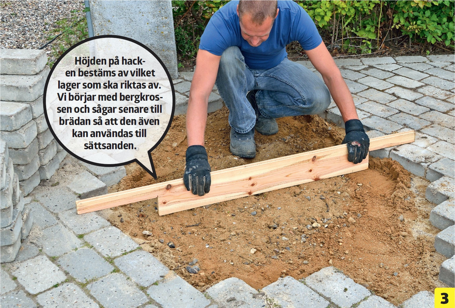I varje ände av brädan markeras ett hack. Hackets djup bestäms av vilket lager som ska riktas av. Vi ska först använda det till att rikta av bergkrossen, så hackets djup ska motsvara höjden från överkanten av stenen ned till 2-4 cm under stenen. Det ger plats åt sättsanden. Dra till sist av 1 cm, då bergkrossen sätter sig 1 cm när den komprimeras.