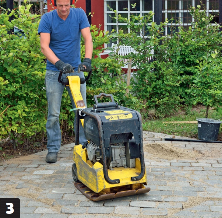 Består din beläggning av plattor är tillvägagångssättet detsamma. Sättsandslagret ska komprimeras mer noggrannt, och det ska bara vara 0,5 cm “för högt”. Markvibratorn ska inte vara lika kraftig: max. 90 kg med en slagkraft på max. 70 kN/m2.