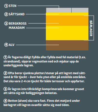 När sten och sättsand är avlägsnat, är det dags att ta reda på orsaken till att fördjupningen uppstått. Har lagret av bergkross satt sig måste det jämnas ut och stampas innan du fortsätter.