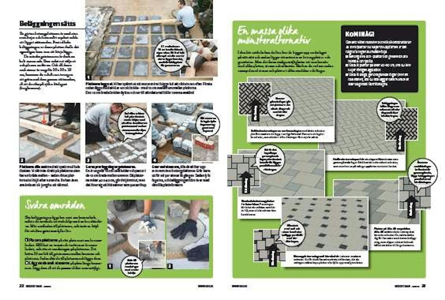 Gör en provläggning av gatstenarna. De är ungefär 10 cm i alla ledder och passar i de 10 cm breda mellanrummen. Då plattorna mäter 40 x 40 cm, går det jämnt ut, men det lönar sig att hitta stenar som passar ihop.