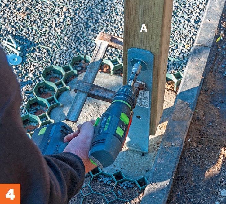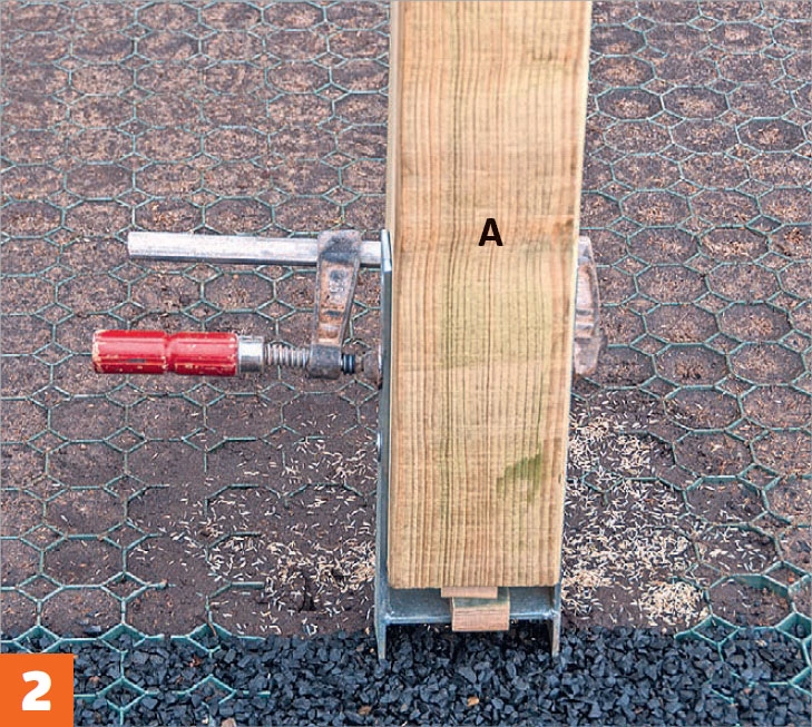 Sätt stolpen (A) i stolpskon. Spänn först fast den endast tillfälligt med en tving, tills du har justerat alla stolparna på plats. Spänn upp ett murarsnöre som du kan rikta in stolparna efter, så att de står på en rak linje. Om det är nödvändigt att justera stolparna lite på höjden, kan du lägga ett par distansklossar eller kilar under.