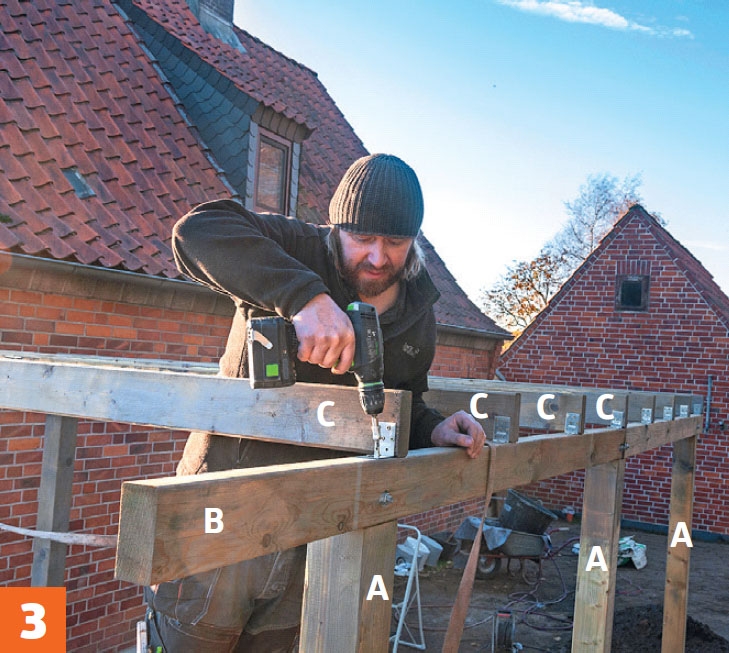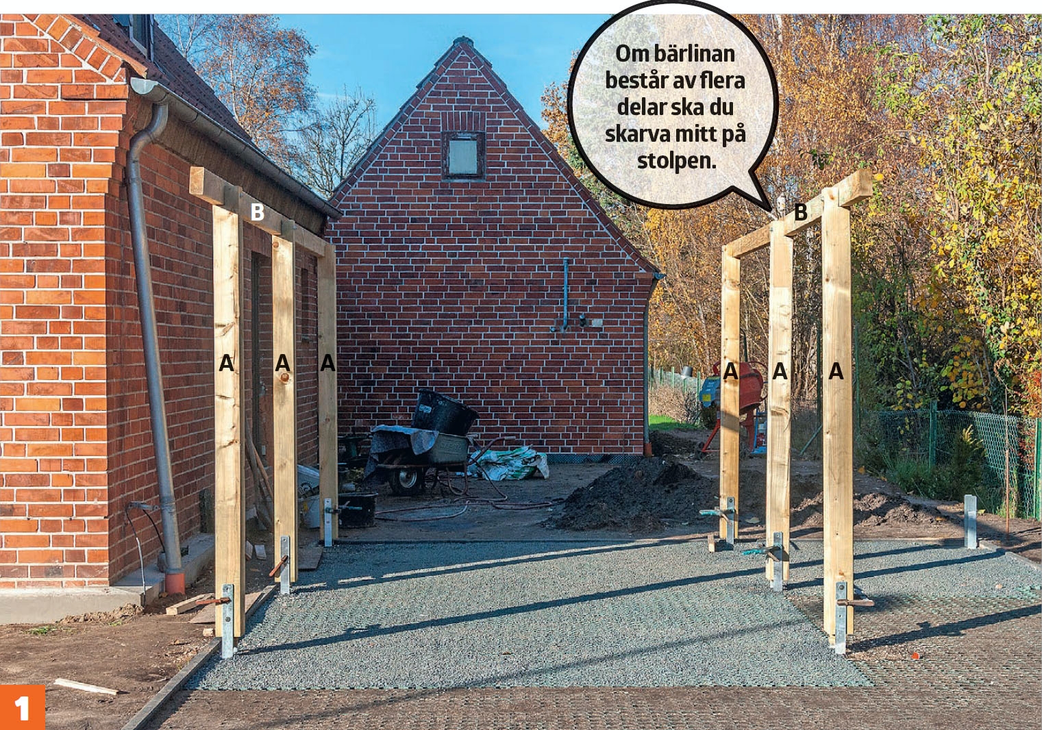 Montera bärlinor (B) på stolparna (A), så konstruktionen blir stadig och du har något att fästa takreglarna i. Bärlinorna sätts så att de sticker ut 30 cm över den främre stolpen och 15 cm över den bakre stolpen.