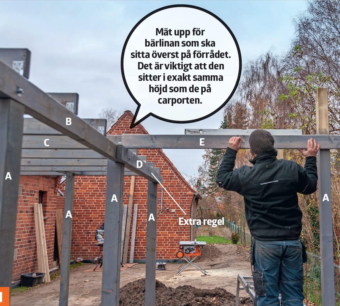 Sätt två stolpar (A) i marken till förrådet. De placeras mitt för de bakre stolparna på carporten, enligt samma princip som övriga stolpar. Mellan de två bakre stolparna på carporten sätts en extra regel, som takreglarna (E) till förrådet kan vila på. Sätt upp en bärlina (D) på utsidan av förrådet. Den fästs med gängstänger på samma sätt som bärlinorna (B) på carporten.