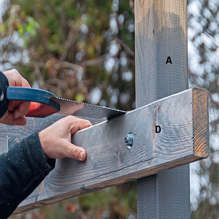 Stolparna (A) sågas till, så att de är i höjd med överkanten av bärlinan (D). Bärlinorna ska också sågas till på längden, så att de fluktar med stolparnas utsida.