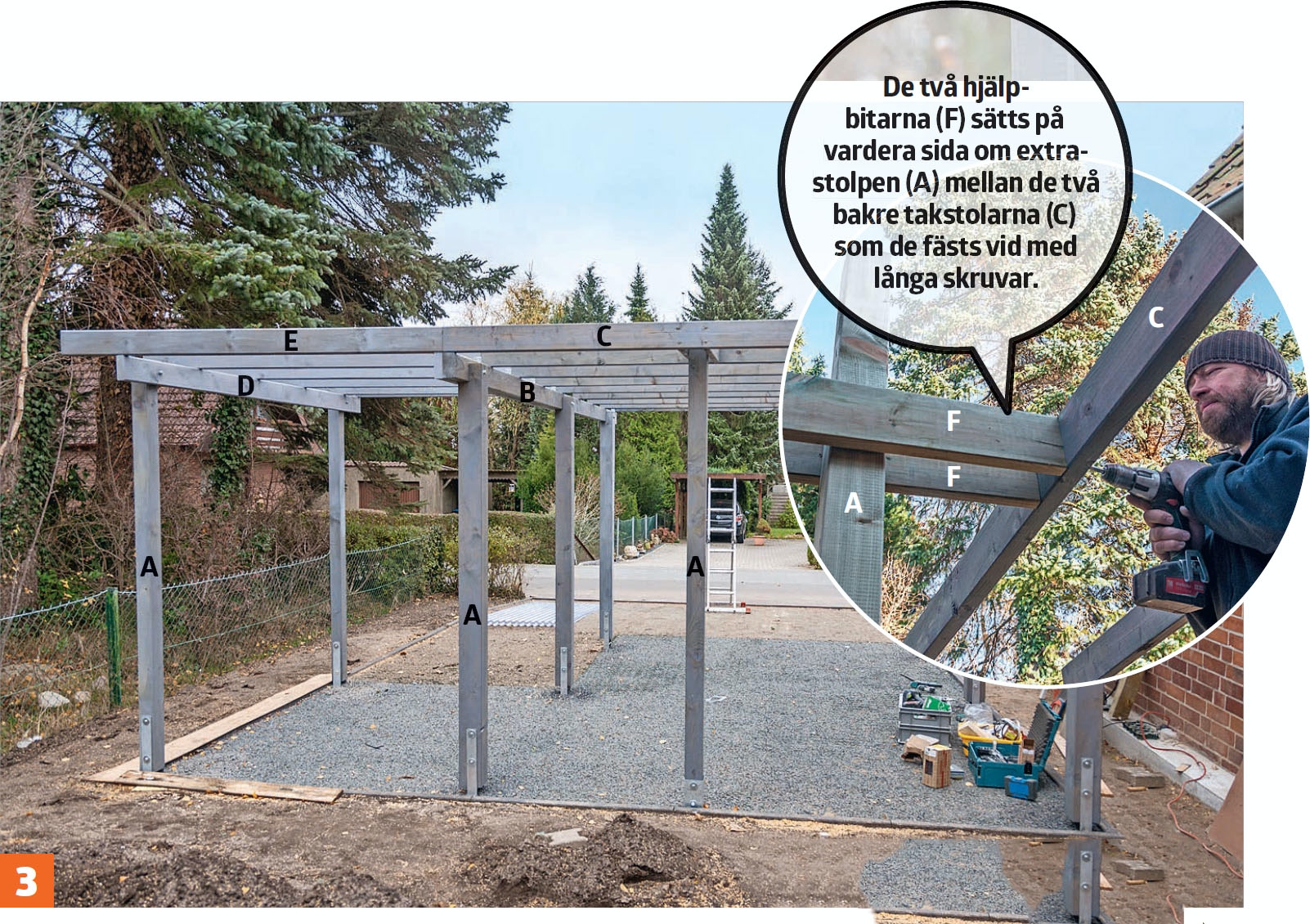 Fäst två hjälpbitar (F) på den extra stolpen på carportens baksida. På vardera sida om stolpen fästs hjälpbitarna mellan de två bakre takreglarna för att stötta taket vid den extra stolpen.