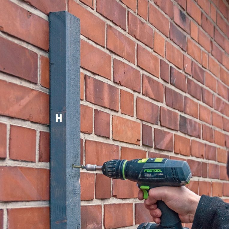Här ska ribborna gå ända in till väggen, så det ska sättas en stolpe (H) så att det finns något att fästa ribborna i. Stolpen fästs med långa skruvar, 5 x 60 mm. Kom ihåg att förborra.