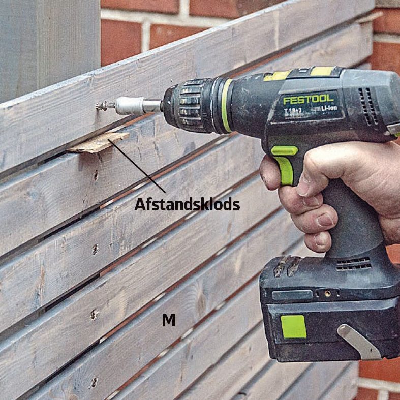 Ribborna (M) sågas till och monteras. De skruvas i stolparna med 4,5 x 43 mm skruvar med 8 mm distansklossar, så att det blir samma avstånd mellan alla ribbor.