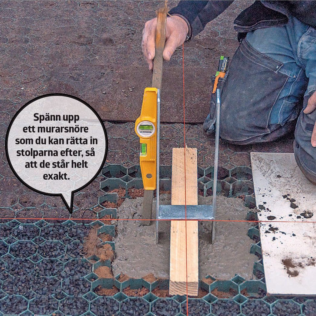 Den U-formade stolpskon placeras i betongen. Lägg först en tvärslå över hålet, t ex en bit läkt, som kan hålla stolpskon så att den inte sjunker ner i betongen. Kolla med ett vattenpass så att stolpskon står rakt. Det är viktigt att du trycker ner t ex en bit läkt i betongen några gånger för att avlägsna eventuella luftbubblor och se till att betongen sluter helt tätt runt stolpskon.