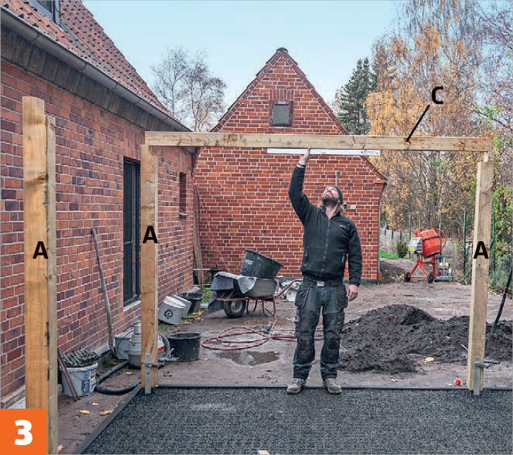 Lägg en tillfällig takregel (C) på ett stolppar. Kolla att den ligger helt rakt och finjustera eventuellt stolparnas placering. Se till att stolparna på den ena kanten står lite högre än på den andra, så att taket får ett fall. Ett fall på 2 cm per meter är lagom.