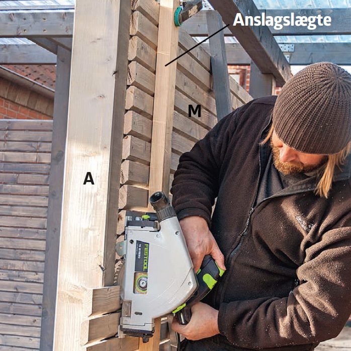 Såga till ribborna (M) i ändarna när alla är iskruvade på en sida, här den ena långsidan av förrådet. Om du sätter en läkt tvärs över ribborna, vilken cirkelsågen kan såga längs, får du ett snyggt rakt snitt. Du kan också använda en sänksåg med styrskena.