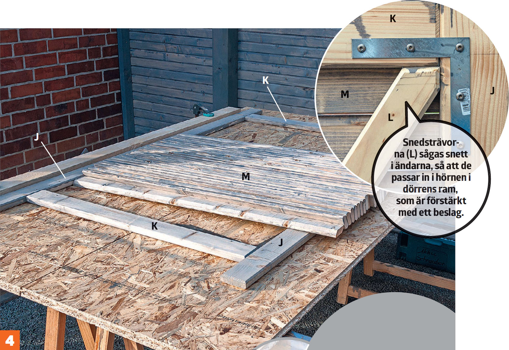 Dörrarna monteras på ett plant underlag med räta vinklar. Gör först en ram (J och K) som ribborna (M) kan fästas i med 4,5 x 40 mm skruvar. Sätt också en snedsträva (L) på alla dörrar från nedre hörnet på den sida där gångjärnen sitter. Det stabiliserar dörren.