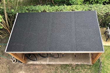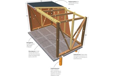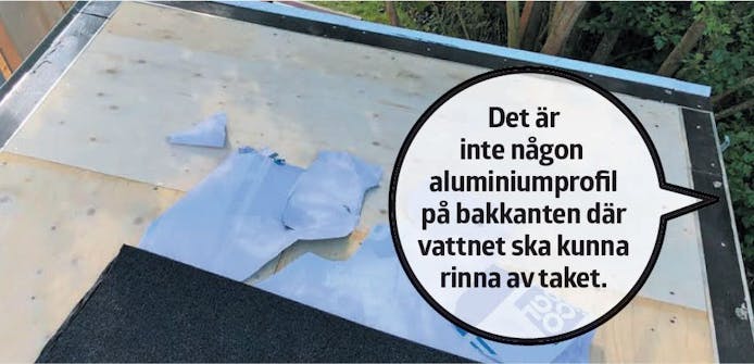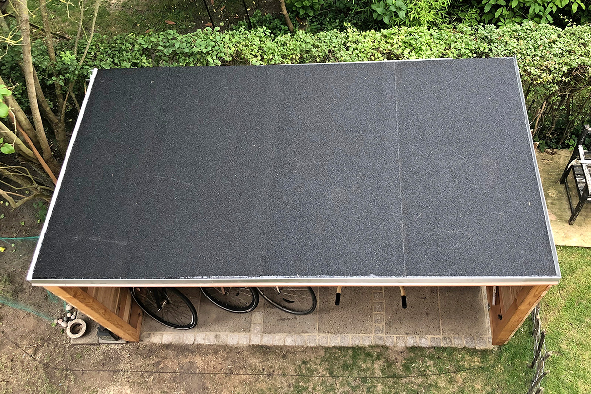 Undertaket består av 15 mm takplywood som skruvas fast i spärrarna. Taket får en fin lutning när de främre stolparna är 195 cm och de bakre är 180 cm höga. Längs tre av kanterna sätts aluminiumprofiler, innan den självklistrande takpappen läggs på, med överlapp så att skarvarna blir täta.