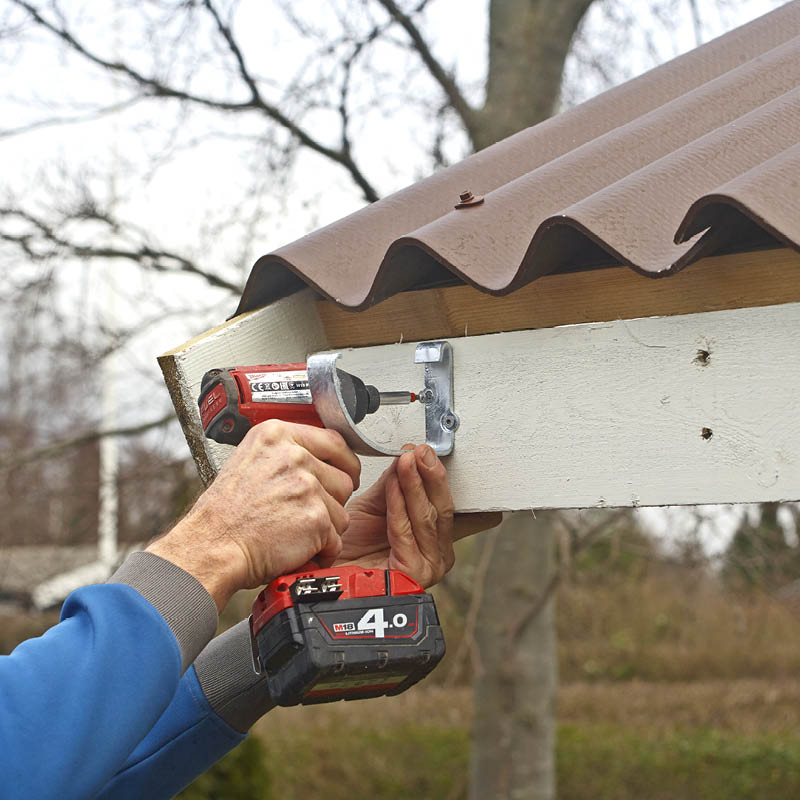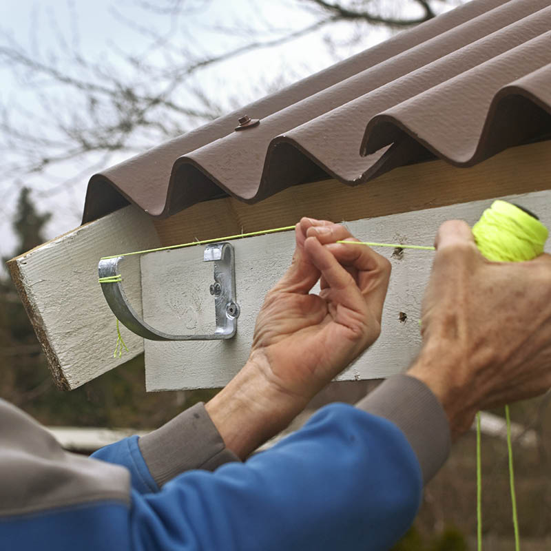 Den första rännkroken sätts så högt som möjligt på takfotsbrädan. Vi binder fast ett snöre i kroken.