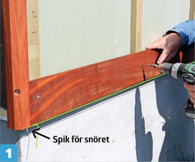 Spänn fast ett snöre vågrätt som den första brädan fästs längs. Snöret spänns mellan två spikar som fästs under hörnlisterna. Brädans underkant ska följa snöret.