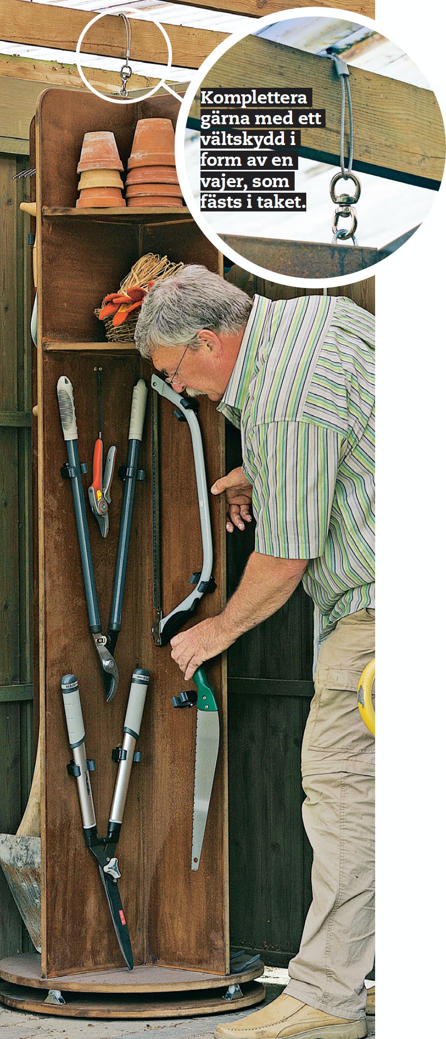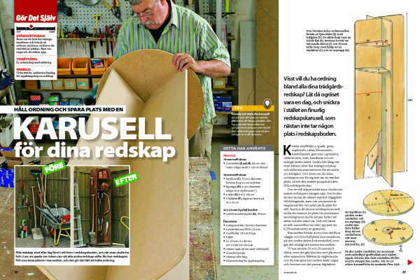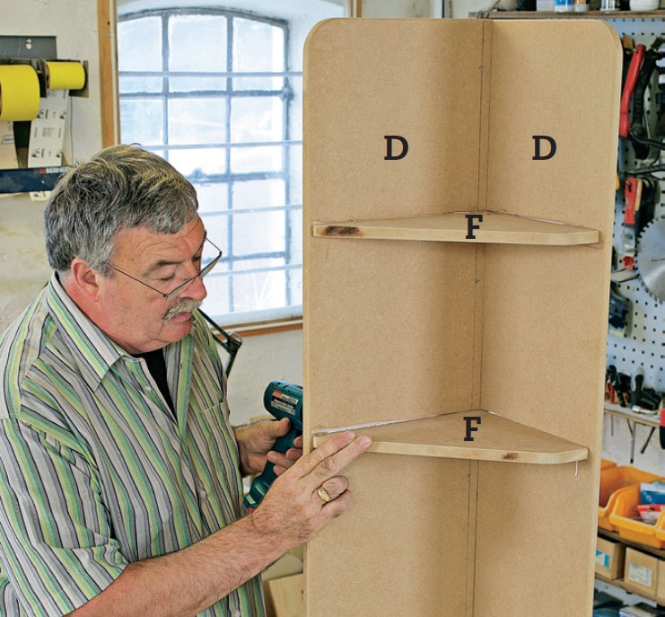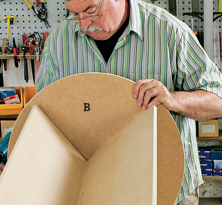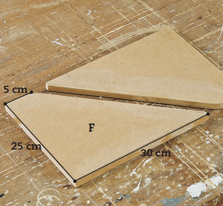 Hyllplanen (F) är nästan trekantiga, och du kan spara material om du sågar ut två hyllplan ur varje skivbit. Hyllplanen är naturligtvis praktiska till förvaring, men framför allt medverkar de till att stabilisera karusellen.