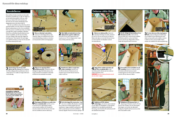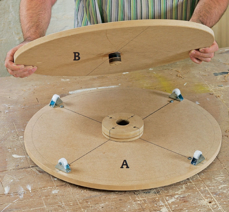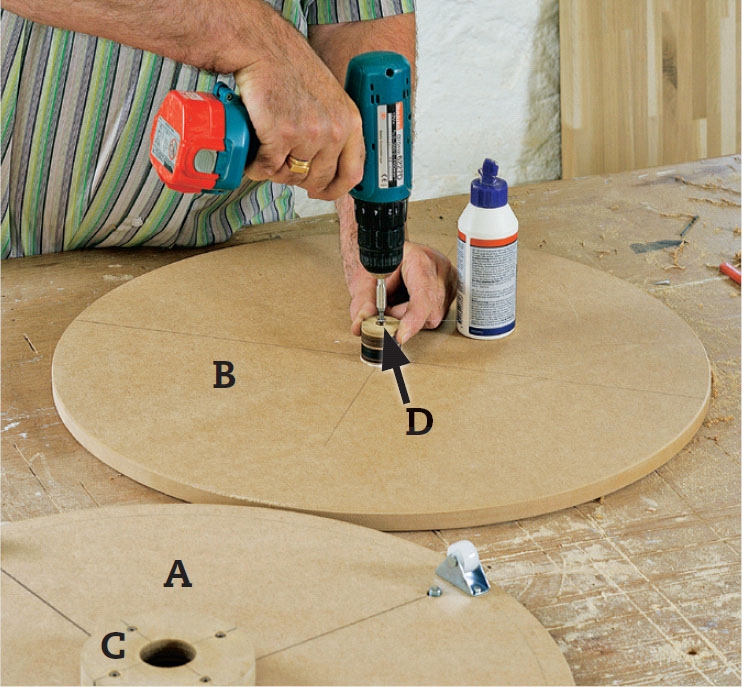 För att rondellerna ska sitta ihop även när karusellen snurras, fästs en styrtapp (D) på undersidan av den övre rondellen. Den ska passa i styrklossen (C), som fästs ovanpå den undre rondellen. Därefter fästs fyra möbelhjul (puffrullar) på den undre rondellen, så att den övre kan snurras. Hjulen ska vara lite högre än styrklossen. Våra hjul är 34 mm höga och därför limmar vi ihop två 16 mm skivor till en kloss på 32 mm.