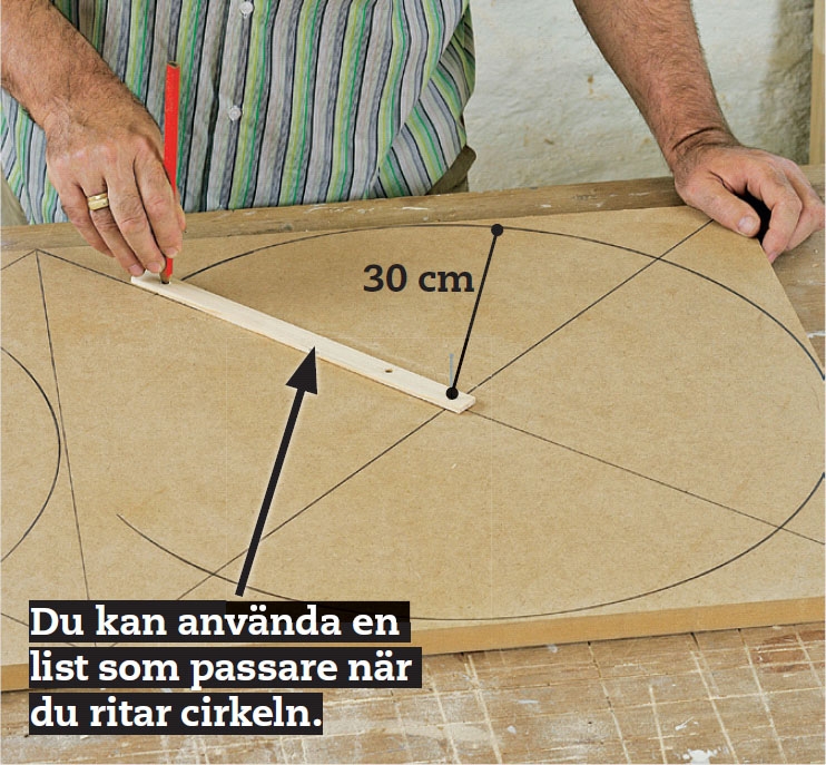 Rita en cirkel på varje skiva. Centrum är där diagonalerna skär varandra. Såga ut rondellerna (A och B) med sticksåg längs utsidan av strecken och fasa kanterna lätt med slippapper.