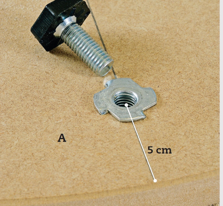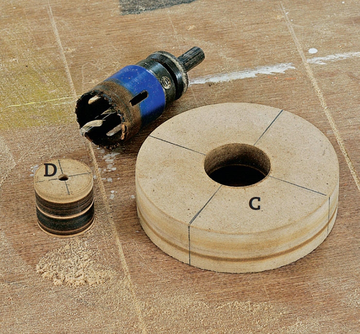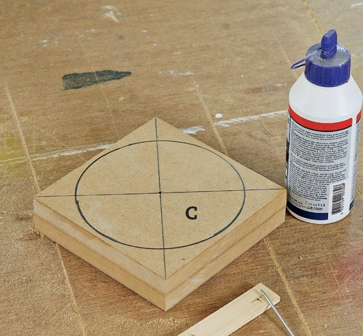 Limma ihop två 16 mm mdf-skivor på 16 x 16 cm till en styrkloss (C). Rita ut diagonalerna på klossen, rita en cirkel med 7,5 cm radie och såga ut klossen med sticksåg.