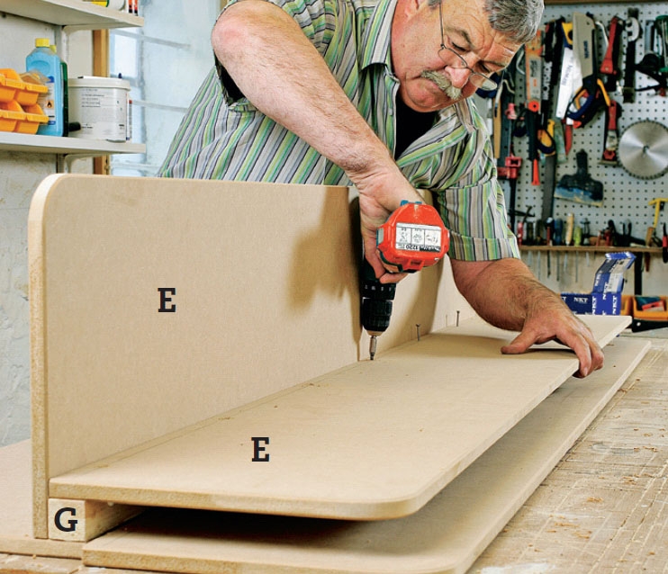 Fäst en av sidorna (E) på den lodräta listen (G) längs ena sidan. Använd lim och 4 x 35 mm skruvar på var 30:e cm. Nästa sida skjuts in mot den första, limmas och skruvas fast. Gör likadant med de två sista sidorna.