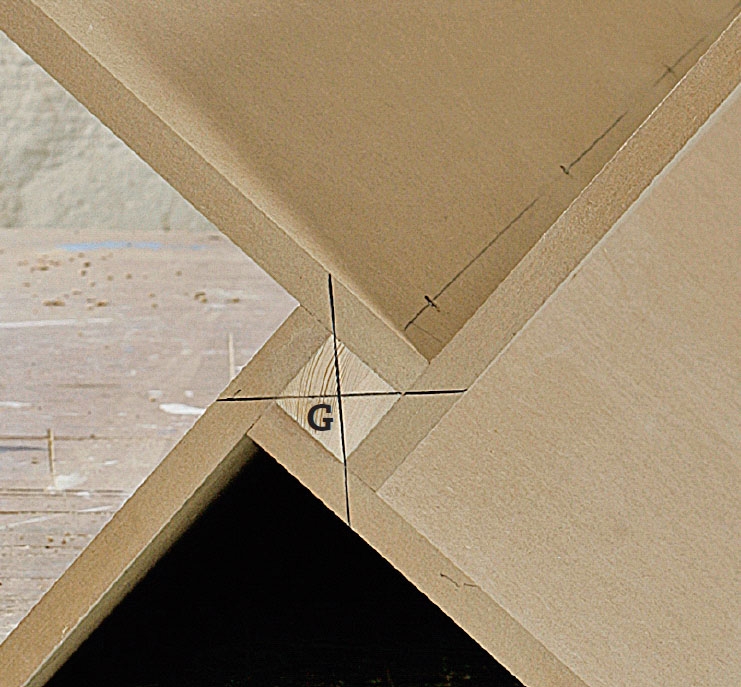 Det är viktigt att karusellens övre del placeras rätt. Listen (G) ska hamna exakt mitt i centrum på rondellen (B). Markera därför centrum på listen genom att rita upp diagonalerna. Borra sedan hål i krysset med 3 mm borr.