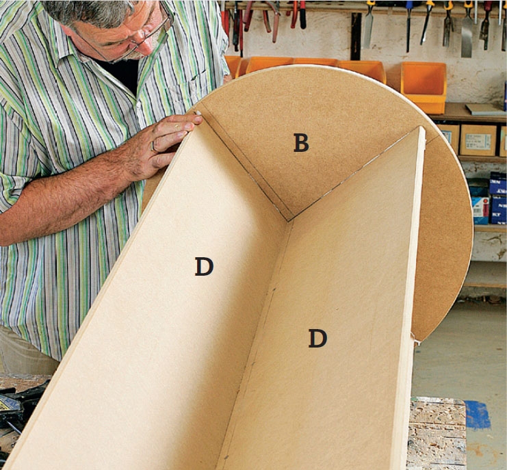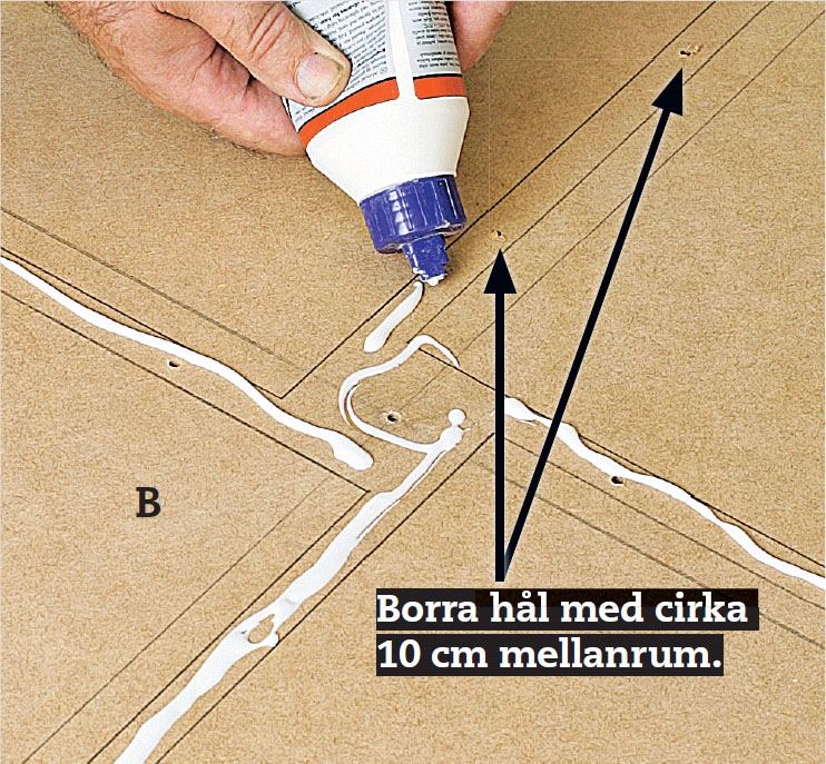 Lägg på lim mellan strecken på den övre rondellen (B) när du har förborrat för de skruvar som sidorna sedan ska fästas med.