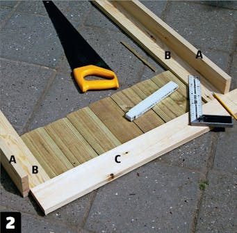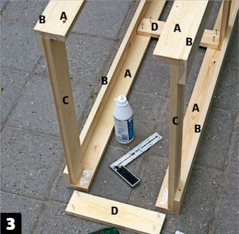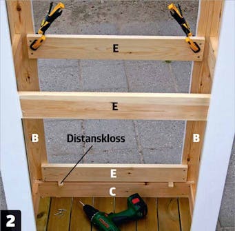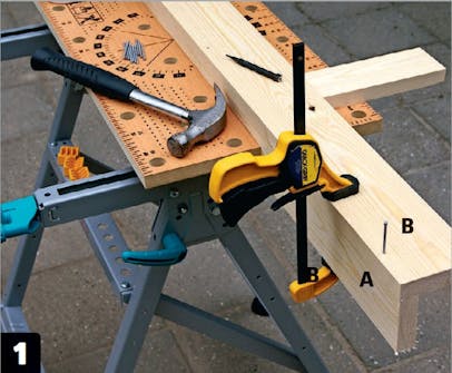 Gör de fyra hörnstolparna. De sätts ihop av två delar (A och B). Sätt trälim i skarven och spänn ihop de två delarna med tvingar medan limmet torkar. Förstärk skarven med 2,5 x 55 mm-dyckert.