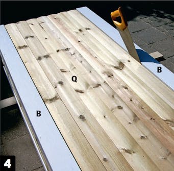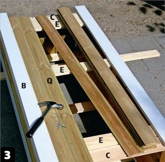 Mät upp tvärslåarna (C), och såga upp dem. Det är smart att göra en provmontering med bitar av panelbrädorna (Q) som läggs mellan hörnstolparna. Glöm inte såga av sponten på den yttersta brädan.