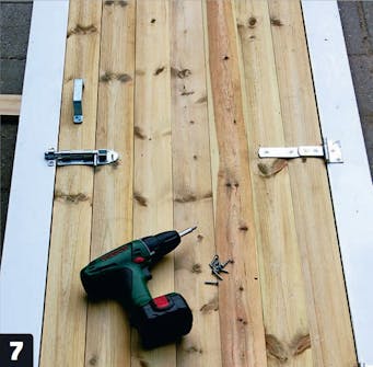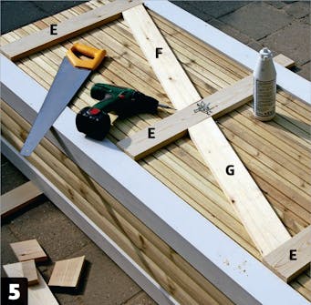 Fäst snedsträvorna (F och G) på dörrens baksida. Snedsträvorna sågas till så att de passar mellan tvärslåarna (E). De fästs med 4 x 40 mm-skruvar.