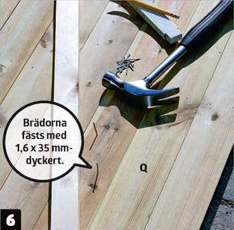 Brädorna skruvas fast vid konsolerna och den sneda skarven under de innersta brädorna förstärks med hålplatta. De fästs med 4 x 20 mm-skruvar.