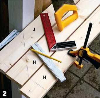 Sätt tre brädor på konsolerna med ett avstånd på 1 cm och rita upp var de ska kapas. Här ska de två innersta brädorna snedsågas medan den yttersta sågas med ett rakt snitt.