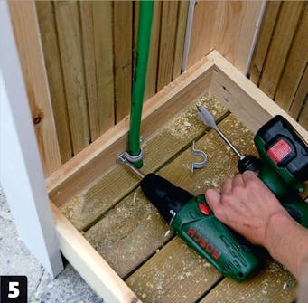 Borra också hål i botten av boden, så att det går att få in en trädgårdsslang. Fäst också ett U-beslag runt slangen, så att den hålls på plats längs väggen på boden.