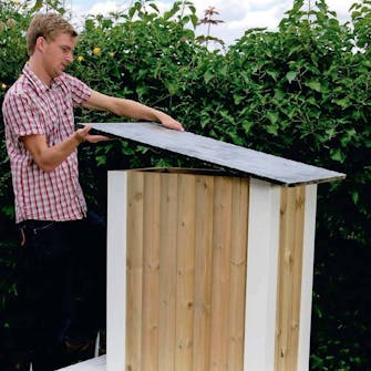 Taket är mycket enkelt och består bara av en stenskiva som läggs ovanpå boden. Den är tung, så boden står mycket stadigt med plattan ovanpå. Boden kan fästas med vinkeljärn mot marken, så att den står helt stilla.