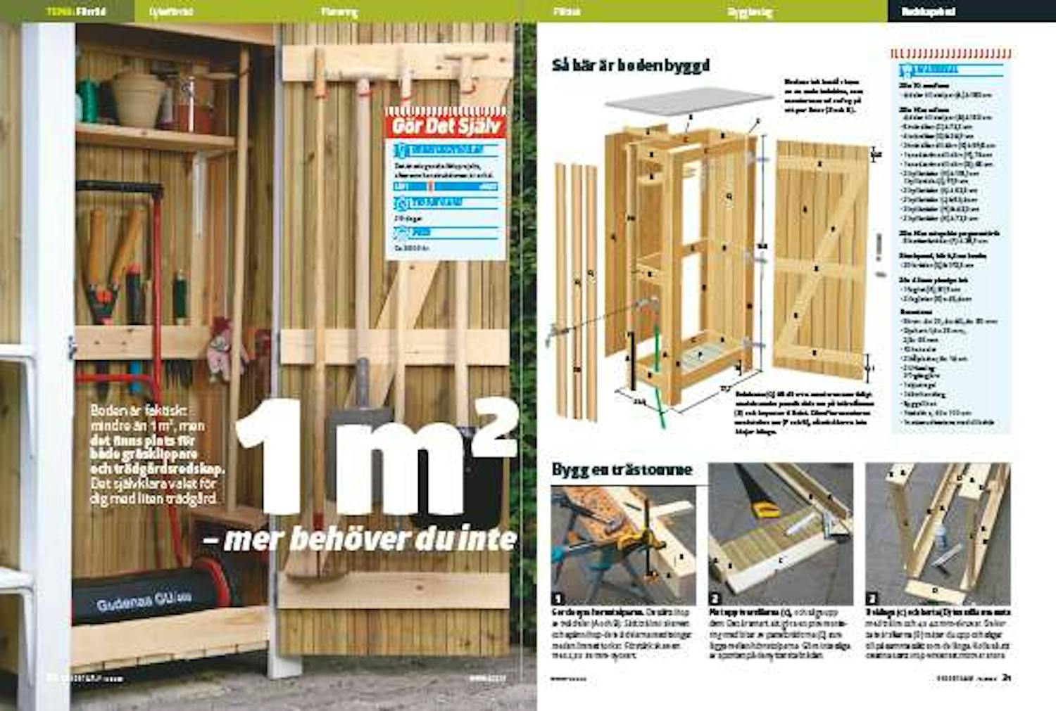 Trästommen ska kläs med brädor - här har vi valt smal stockpanel till sidor och dörr. Det kan dock vara lättare att hitta en bredare panel. I botten av boden lägger vi tryckimpregnerat trä, som står emot fukt.
