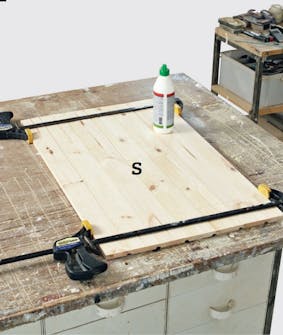 Såga till brädorna (S) så att de passar i längd och sätt ihop den i not och spont. De två yttersta sågas på längden tills de blir lika breda. Ta isär brädorna och limma ihop dem i noterna.