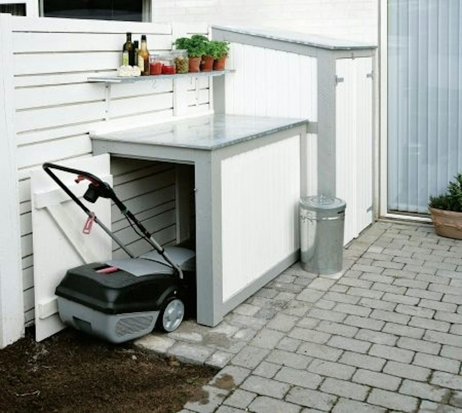 Det lilla skjulet med grillbord kan nu skruvas fast på de vågräta tvärstagen på det stora skjulet och på staketet.