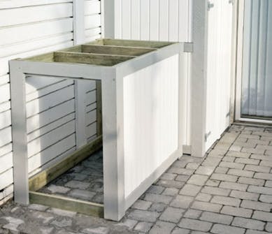 Stommen till skjulet monteras på staketet och fasaden med 5 x 60 mm skruvar. Vi har ”snålat” lite på utelasyren och endast målat de delar som kan utsättas för regn.