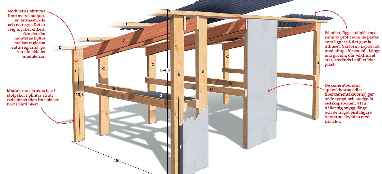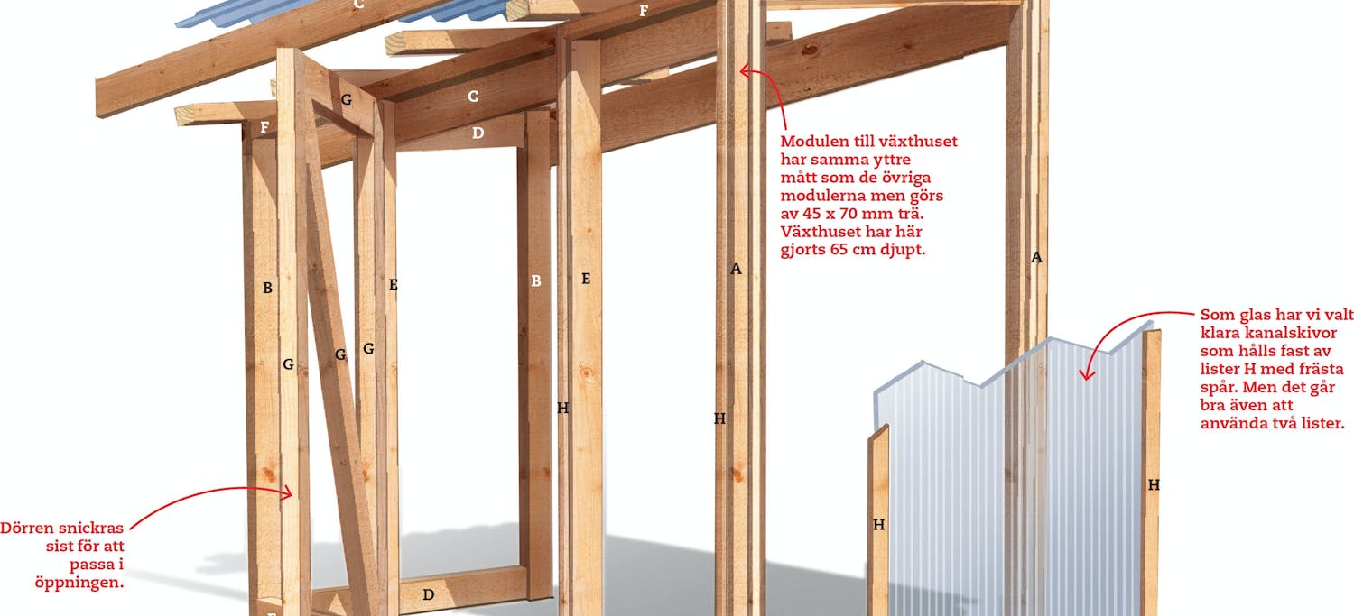 Nu bygger vi ut redskapsboden på ena gaveln med ett litet växthus. Ja, vi har egentligen tjuvstartat, för när vi reste stommen, fäste takreglarna och monterade takskivorna så satte vi upp en sjätte modul. Den har samma yttre mått som de fem andra modulerna men snickras av klenare reglar.