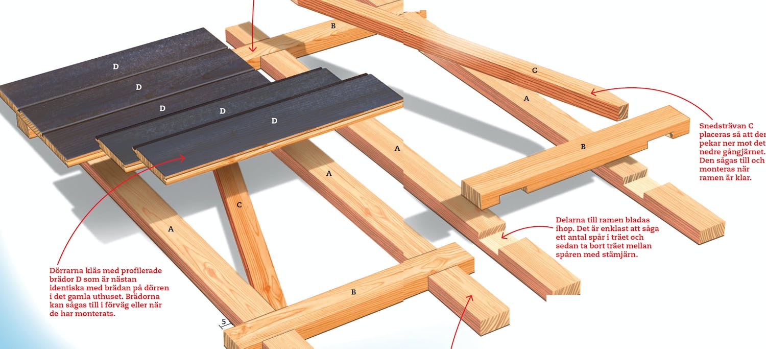 Storleken anpassas efter öppningen och det ska vara cirka 4 mm luft hela vägen runt dörren. Delarna till ramen bladas ihop eftersom det ger en stark konstruktion. De vågräta reglarna fästs en sjättedel ner resp. upp på de lodräta - alltså där gångjärnen ska monteras. De lodräta dras in 5 cm från ändarna på de vågräta. Beklädnadsbrädorna kan sågas till före eller efter att de sätts fast på ramen.