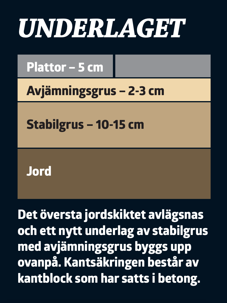Uppbyggnaden är relativt enkel. Plattor överst, avjämningsgrus i ett lager på 2-3 cm, och sedan ett lager stabilgrus på 10-15 cm.