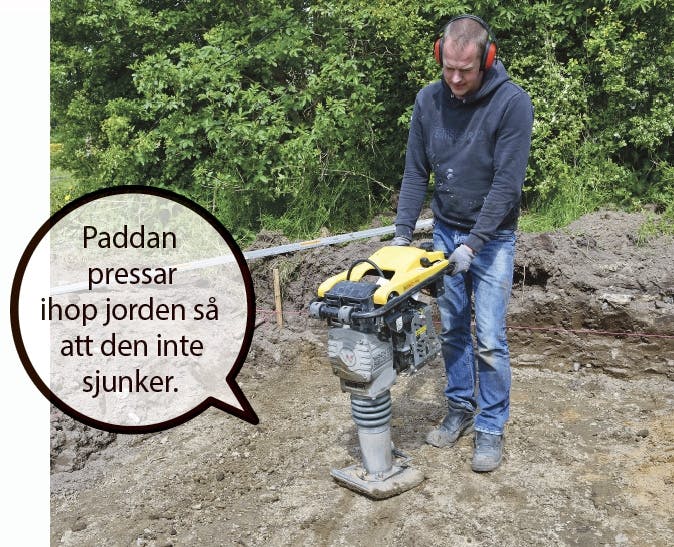 Du bör använda en maskin på 90-100 kg för att packa ordentligt. För att bara få ett tunt lager avjämningsgrus skapar vi en slät yta 3-4 cm under plattornas undersida.