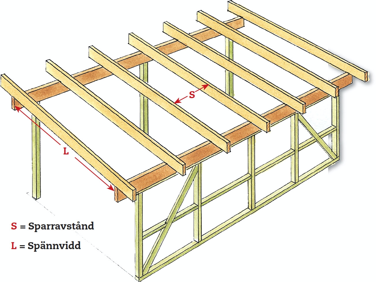 Vid beräkning av dimension börjar du med att bestämma bredden på byggnaden och därefter hur stor spännvidden (L i ritningen på nästa sida) skall vara. Vi talar här om sparrens längd mellan stödpunkterna.