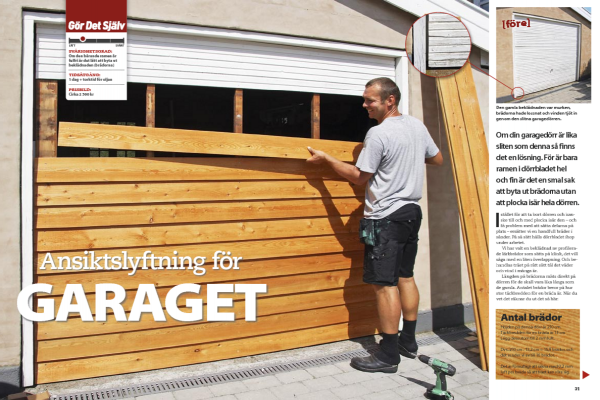 För att ramen inte skall slå sig tar vi endast bort några brädor i sänder - cirka 50 cm - innan vi sätter på de nya brädorna. Eftersom vippbeslagen fortfarande sitter i dörren gäller det att vara försiktig när vikten minskas.